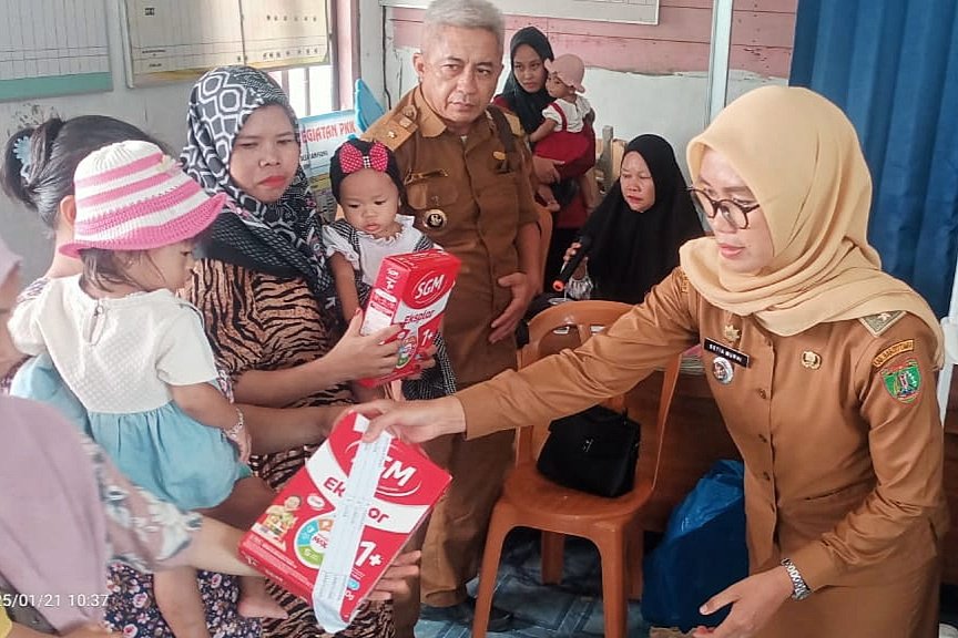 Camat Pematang Karau, Setia Murni, menyerahkan bantuan telur dan susu formula untuk anak terindikasi stunting di 7 desa, Selasa, 21 Januari 2025.