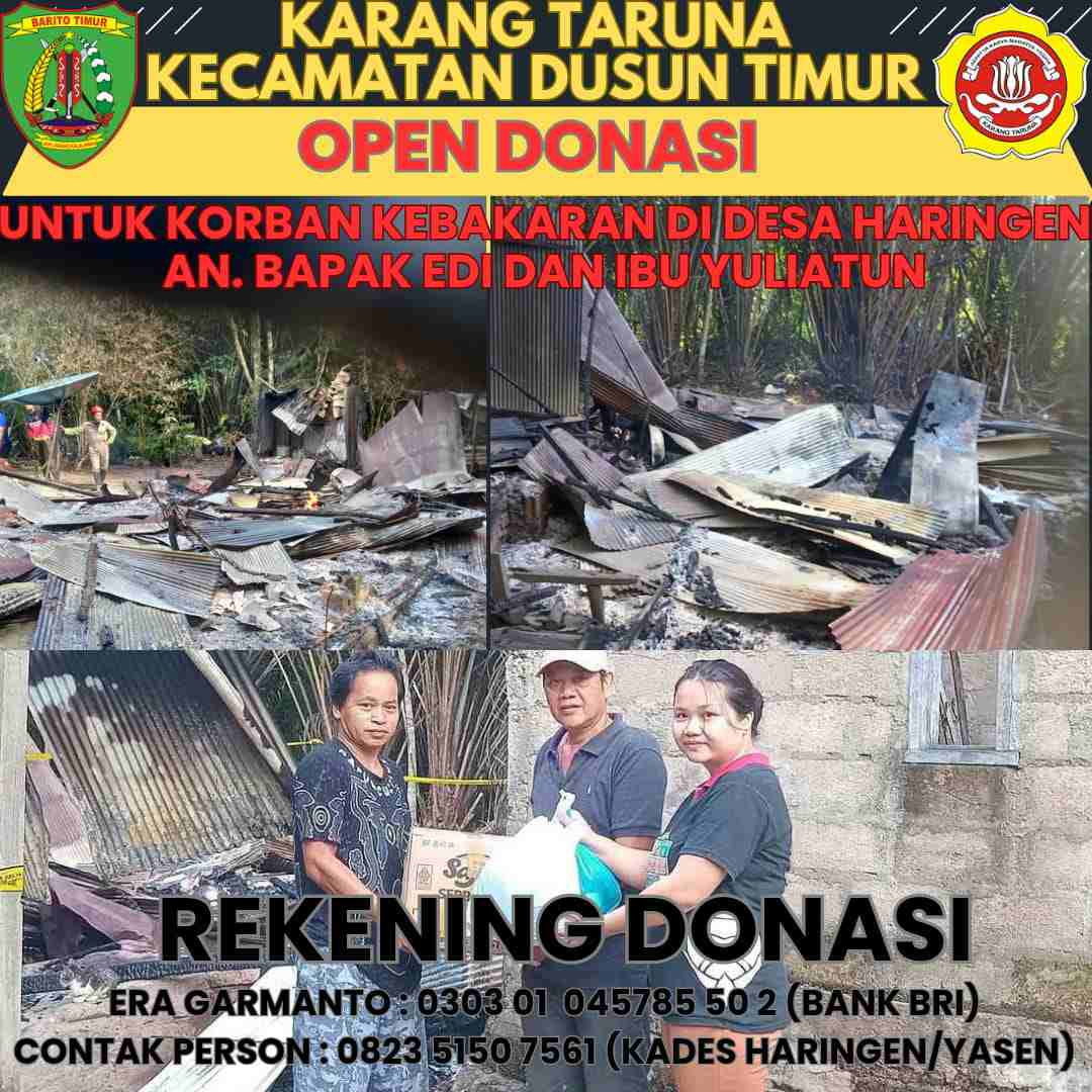 BERITA62.COM, Barito Timur – Karang Taruna Kecamatan Dusun Timur, Kabupaten Barito Timur, memulai penggalangan donasi bagi keluarga korban kebakaran di RT 02 Desa Haringen, Senin, 27 Januari 2025.