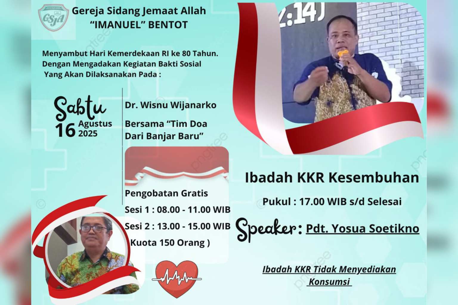 BERITA62.COM, Barito Timur – Gereja Sidang Jemaat Allah (GSJA) Imanuel Bentot, Kabupaten Barito Timur, bekerja sama dengan Tim Doa dari Banjarbaru, akan menggelar rangkaian kegiatan sosial dan rohani berupa pengobatan gratis serta Kebaktian Kebangunan Rohani (KKR) Kesembuhan pada Sabtu, 16 Agustus 2025. Kegiatan ini juga menjadi bagian dari perayaan Hari Jadi ke-23 Kabupaten Barito Timur dan HUT ke-80 Kemerdekaan Republik Indonesia.