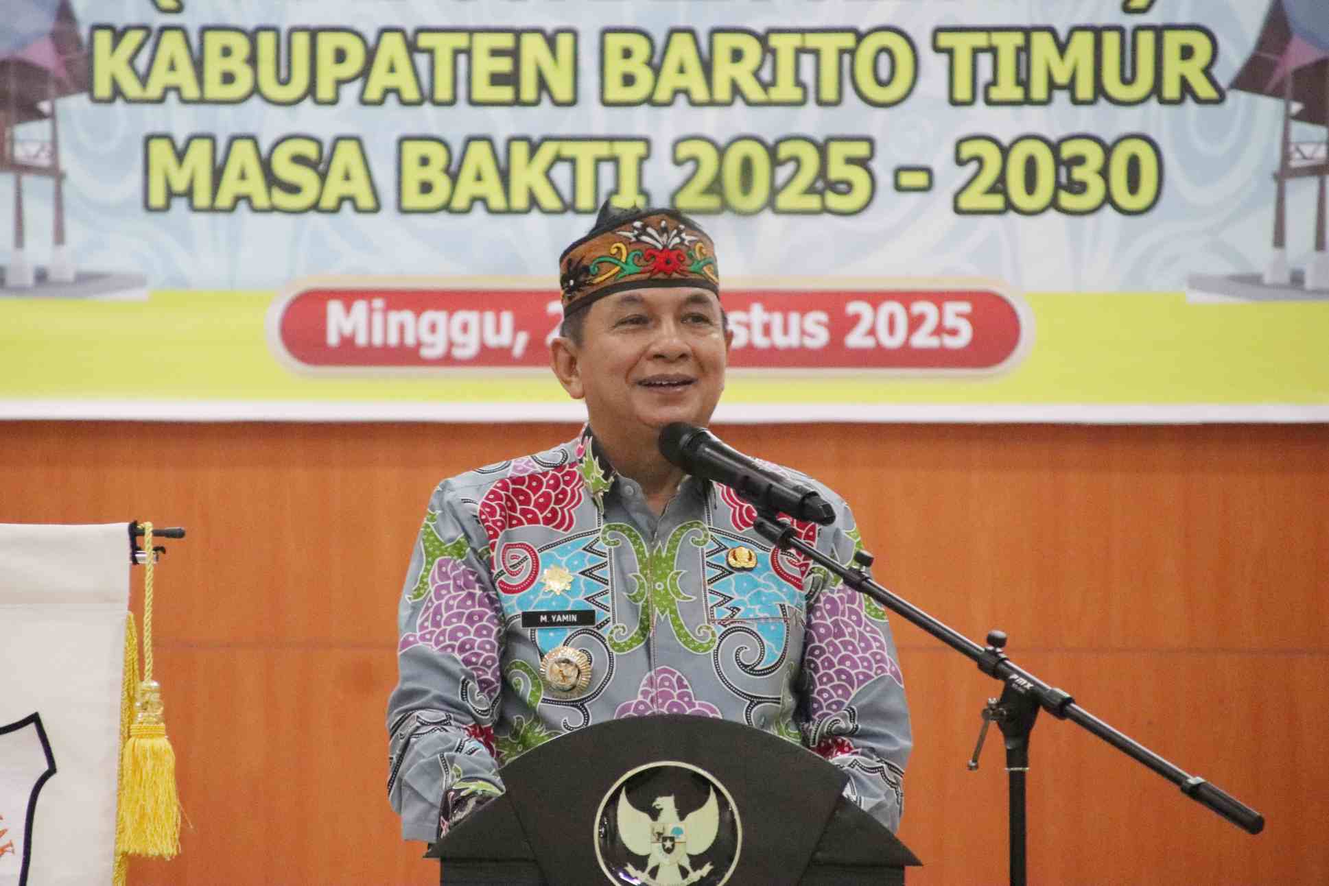 Bupati Barito Timur, M Yamin, menyampaikan sambutan pada pelantikan pengurus KKD Dusmala-Tebama Barito Timur masa bakti 2025–2030, Minggu, 24 Agustus 2025.