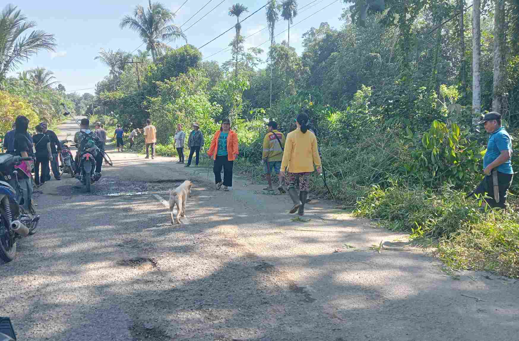 Dalam kegiatan tersebut, warga membawa berbagai perlengkapan seperti parang, mesin pemotong rumput, hingga sapu untuk merapikan rumput liar yang tumbuh di sepanjang bahu jalan.