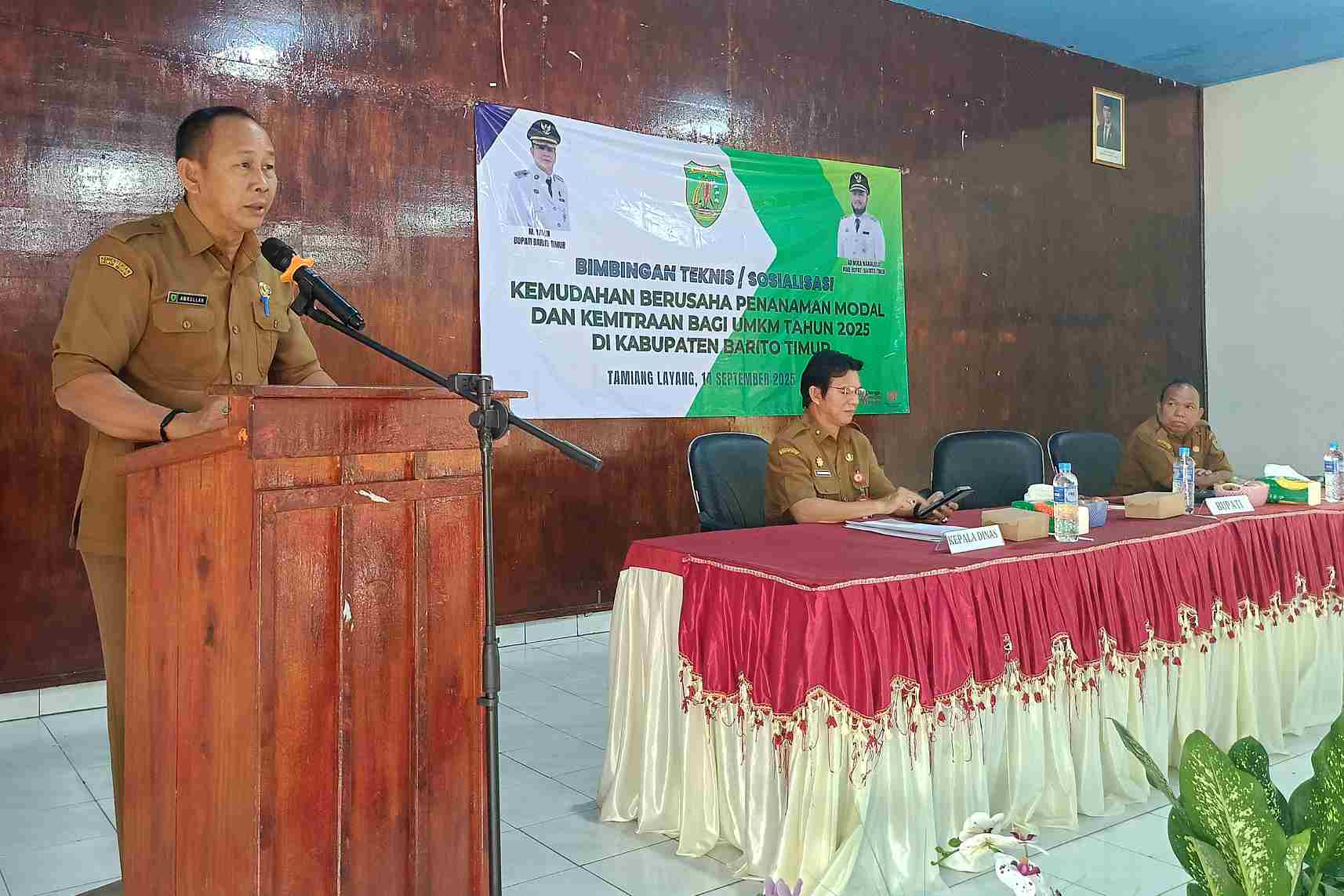 BERITA62.COM, Barito Timur – Asisten II Sekretariat Daerah (Setda) Barito Timur, Amrullah, membuka kegiatan Sosialisasi Kemudahan Penanaman Modal dan Kemitraan bagi Pelaku UMKM yang digelar Pemerintah Kabupaten Barito Timur di Tamiang Layang, Senin, 14 Oktober 2025.