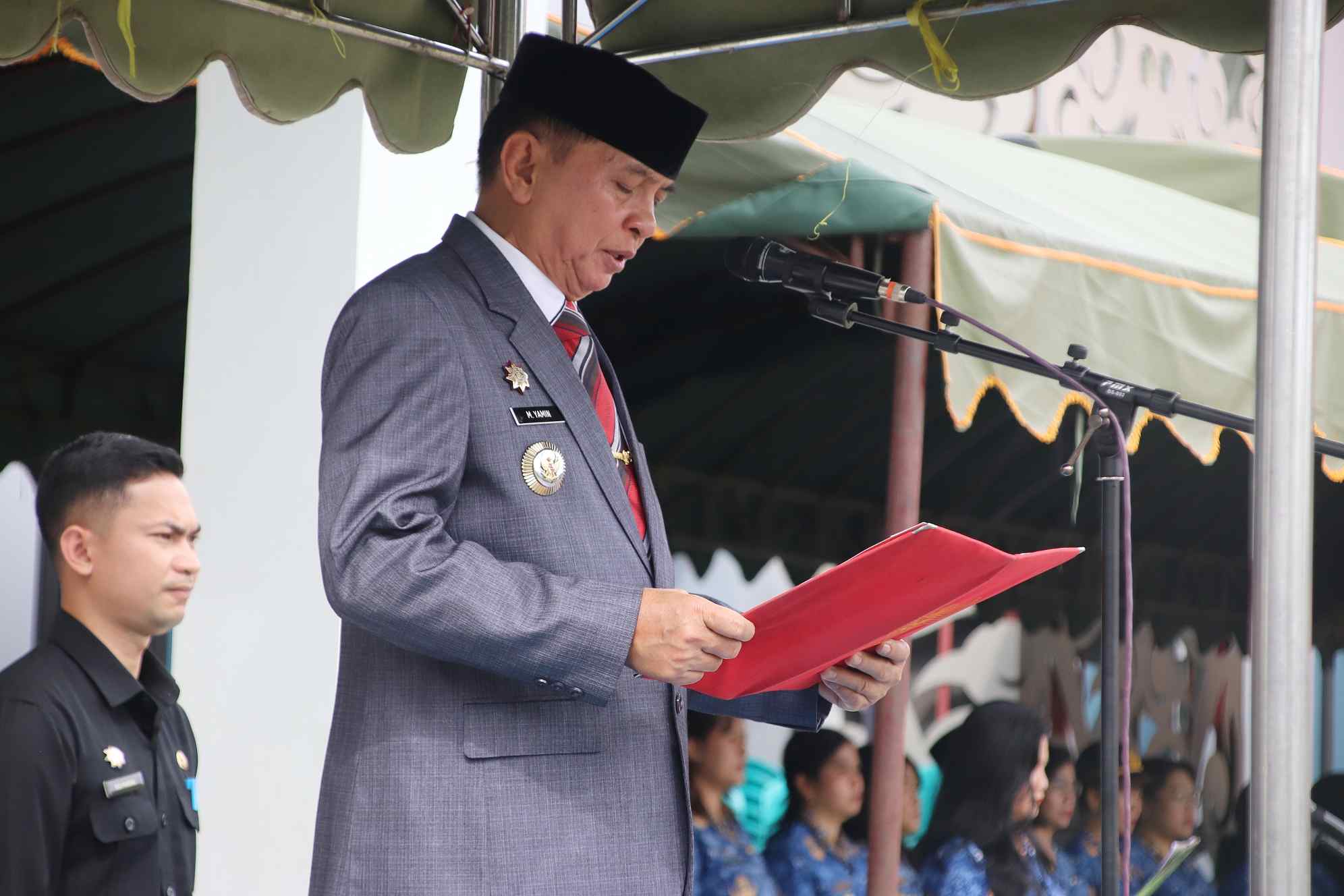 “Hari ini kita menundukkan kepala penuh hormat mengenang para pahlawan bangsa. Mereka bukan sekadar nama yang terukir di batu nisan, melainkan cahaya yang menerangi jalan kita hingga hari ini,” ucap Yamin saat membacakan amanat tersebut.