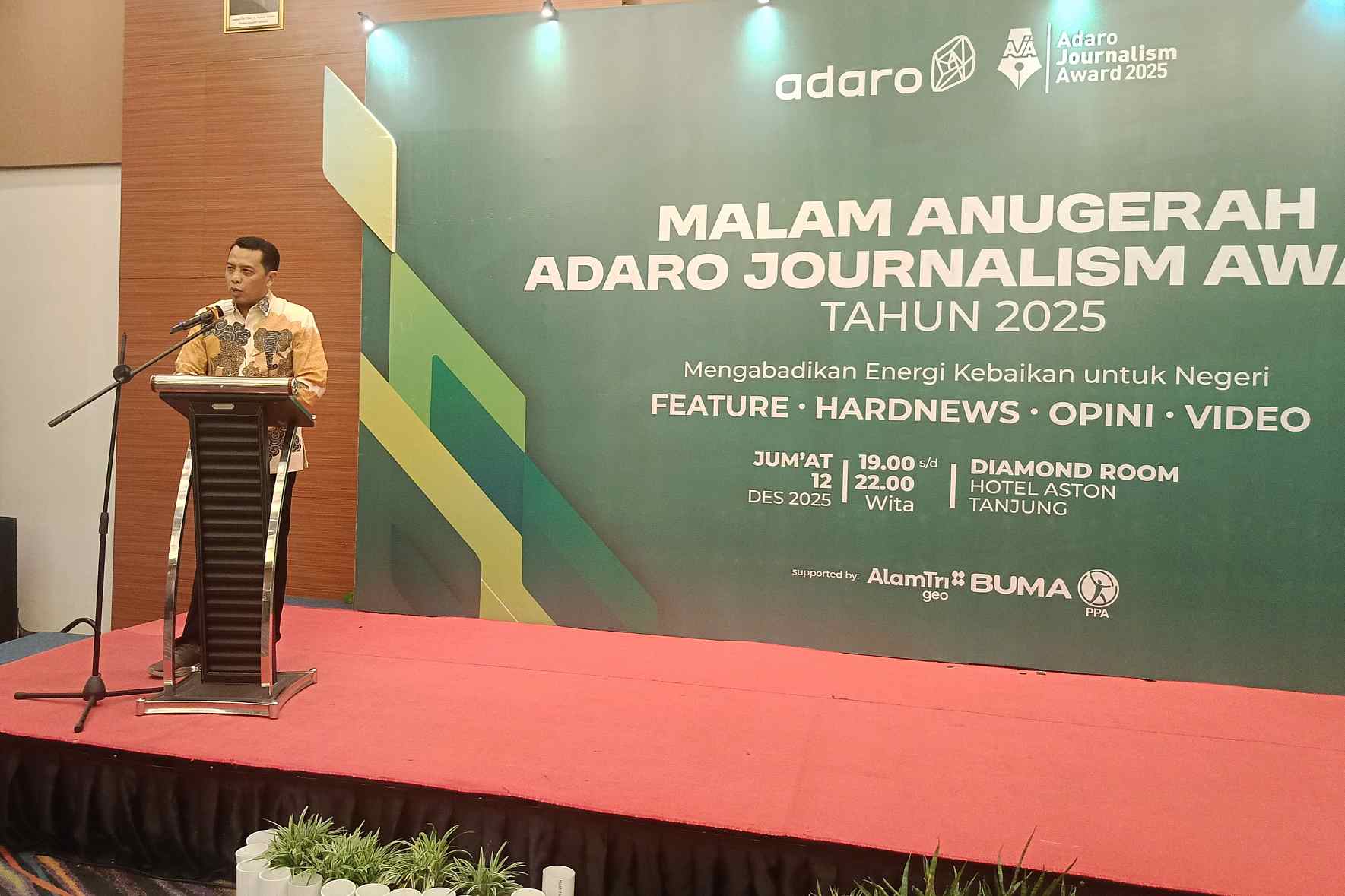 Head of Land and Community Management Department PT Adaro Indonesia, Djoko Susilo, saat menyampaikan sambutan pada Malam Anugerah Adaro Jurnalism Award (AJA) 2025 di Hotel Aston Tanjung, Kabupaten Tabalong, Jumat, 12 Desember 2025.